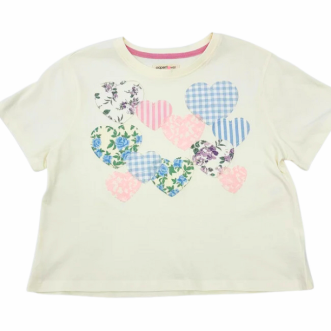 A soft cotton tee featuring layered heart appliqués, designed with a relaxed fit for everyday comfort. Read more.