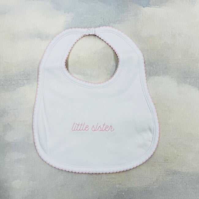 Welcome your little sister with the "Little Sister" Embroidered Bib. This bib is definitely a must have for mealtime, making it a perfect way to welcome the newest family member. Pair it with the coordinating sibling sets.