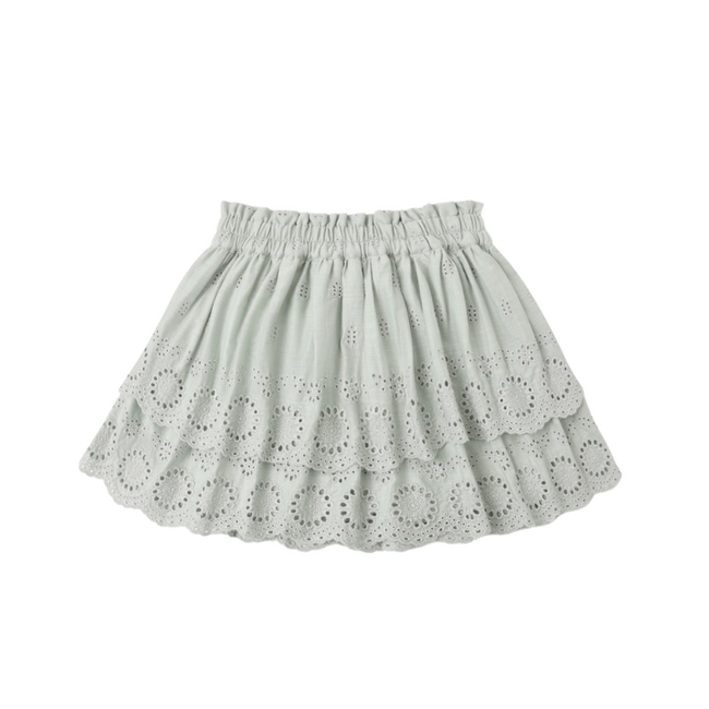The Rose Mini Skirt from Rylee + Cru features a soft seafood color with delicate eyelet details and a tiered silhouette. Designed with a comfortable elastic waistband, this skirt pairs perfect with the matching Swing Top for effortless outfits.